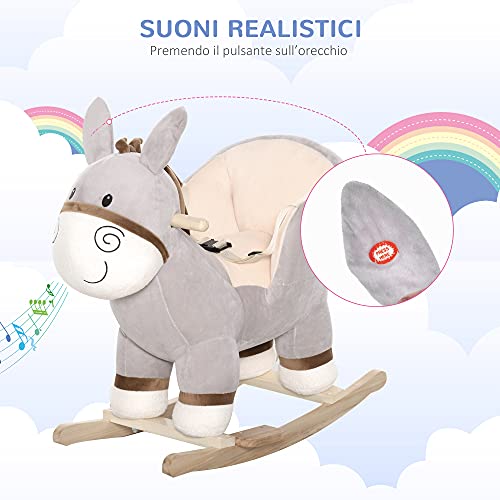 HOMCOM Dondolo Giocattolo a Forma di Asino per Bambini 18-36 in Legno di Pioppo e Peluche Grigio, Suoni Realistici