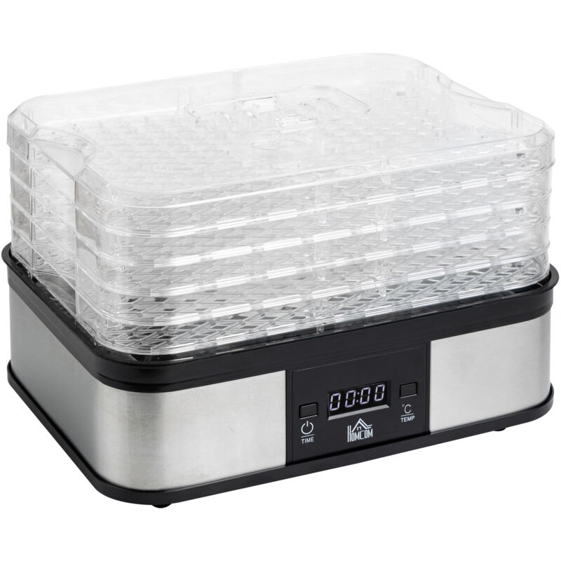 Disidrata frutta, verdura e altri alimenti in modo facile e igienico con questo essiccatore HOMCOM. Con un intervallo di temperatura regolabile tra 40 e 70℃, potrà operare tranquillamente di notte. La confezione è dotata di 5 vassoi per contenere molti alimenti separati, prevenendo la contaminazione incrociata. Il timer ti aiuterà a ottenere il giusto livello di disidratazione desiderato. Versatile e di qualità, non esitate ad acquistare questo essiccatore per alimenti. Caratteristiche: • Preserva le sostanze nutritive, le vitamine originali e il sapore degli alimenti • 5 vassoi impilabili per ampio spazio di conservazione • Sistema di circolazione dell'aria a 360° • Tempo di essiccazione regolabile da 1 a 48h • Temperatura regolabile tra 40 e 70°C • Acciaio inossidabile di facile manutenzione Dati tecnici: • Colore: Argento • Materiale: Acciaio inox, PS, ABS • Dimensioni complessive: 32L x 25P x 29Acm • Dimensioni del vassoio: 31L x 23P x 3.5Acm • Lunghezza cavo: 1m • Capacità di