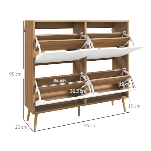 HOMCOM Mobile Scarpiera Salvapsazio in Legno, Scarpiera Slim con 4 Cassetti e 2 Ripiani Regolabili per ogni Cassetto, max 16 Paia di Scarpe, 95x26x95 cm
