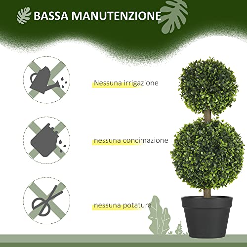 HOMCOM Set da 2 Piante di Bosso a 2 Sfere Realistico con Vaso incluso, Fondo Rinforzato ed erba, in Cemento, PE e PP, 60 cm, Verde