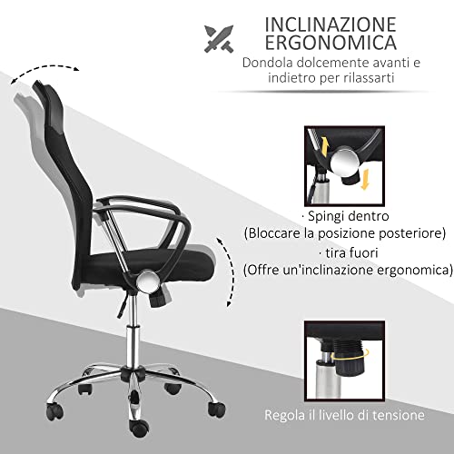 HOMCOM Sedia Ergonomica da Ufficio Girevole e Dondolo con Ruote, Altezza Regolabile e Schienale a Rete, 63x65x109-119cm Nero