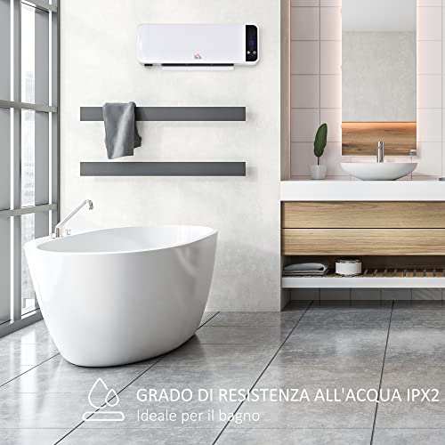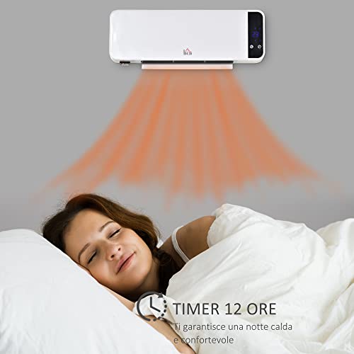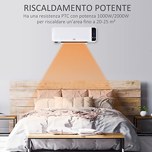 HOMCOM Stufa Elettrica da Parete con Telecomando, Temperatura Regolabile e Timer 12 Ore, Potenza 1000W/2000W, 56x11.5x18.5cm, Bianco