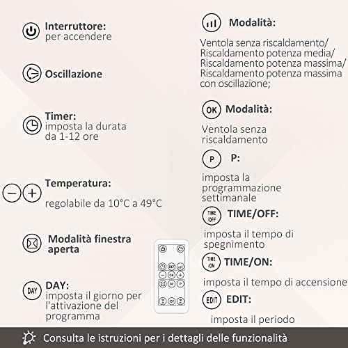 TELECOMANDO E DISPLAY LED: Regola facilmente le impostazioni della stufetta elettrica grazie al pratico display LED e regolarle con il telecomando incluso.