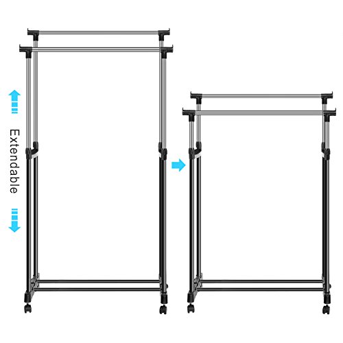 Homdox Appendiabiti da terra, 4 ruote, doppia barra per abiti e scarpiera, regolabile in altezza, Acciaio INOX, Silber + Schwarz, type 1