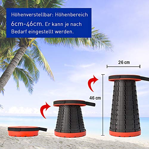 Homease - Sgabello pieghevole portatile pieghevole da campeggio, portata 210 kg, sgabello telescopico regolabile in altezza per campeggio, viaggi, picnic, giardino, barbecue, escursioni, rosso e nero