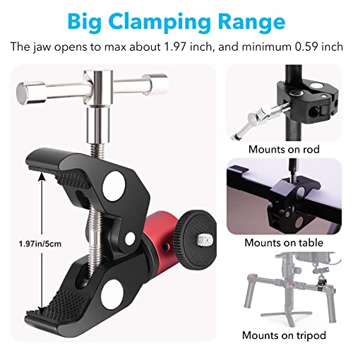Homeet Super Morsetto Clamp con Teste Treppiedi Supporto Pinza Fotocamera Granchio Clip Rotazione a 360°con Filettature da 1/4 "e 3/8" per Monitor/Flash LED/Telecamera/Microfono/GPS【Rosso Teste】