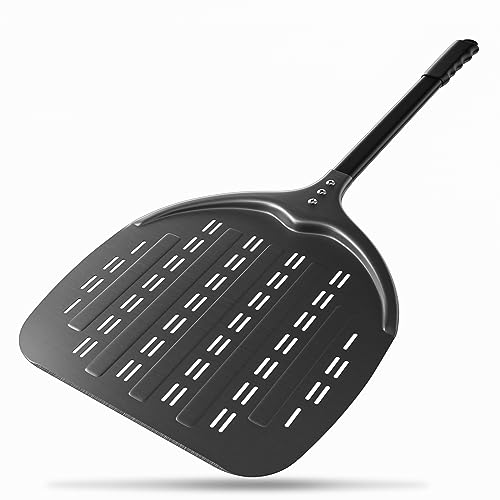 GARANTIRE LA STABILITÀ: questa pala per pizza forata dotata di lama da 40,8x36 cm e manico lungo 42 cm. I giunti rivettati della maniglia ne aumentano la durata. Inoltre, ha molti fori per ridurre il peso e garantire di sollevare e trasportare facilmente pizze molto caric.