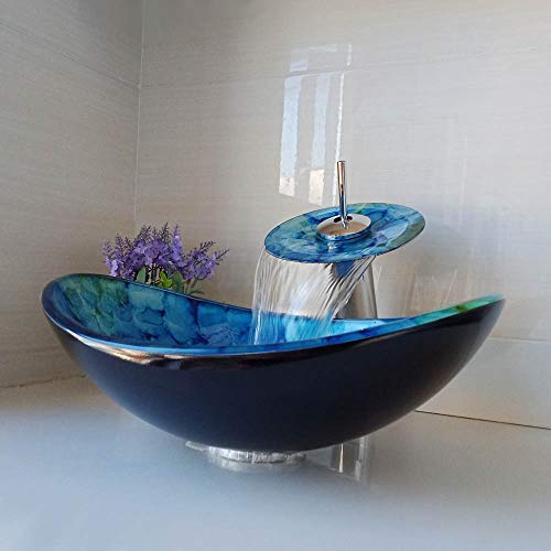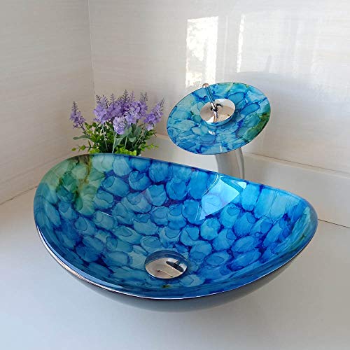 HomeLava Lavabo da Appoggio fatto a Mano Lavabo Bagno ovale blu e verde rotondo in vetro temperato con rubinetto a cascata