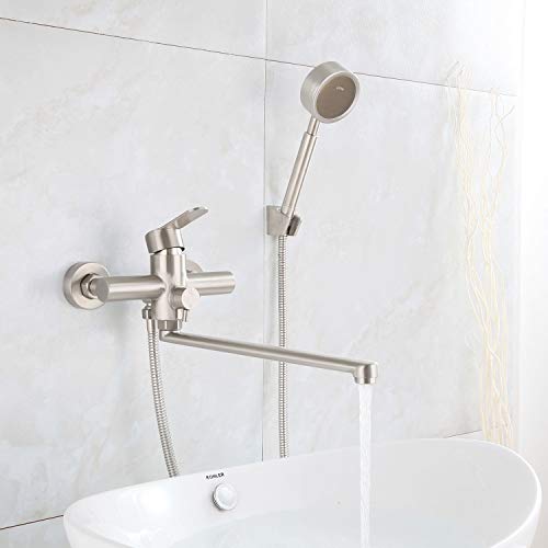 【Superficie in nichel spazzolato】: la superficie in acciaio inossidabile lucidato a mano previene graffi, corrosione e sbiadimento.Doccia a mano sotto pressione: uscita dell'acqua potente e potente, risciacquo migliore. Rubinetto a parete con bocca girevole molto lunga da 350 mm a 306 gradi, flessibile per allargare il posto di lavoro.