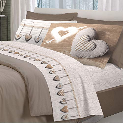 HomeLife Completo Lenzuola Matrimoniali Cotone Flanella, Made in Italy - Include Lenzuola Matrimoniali Invernali Sopra, Lenzuolo Sotto con Angoli e 2 Federe (Fantasia Cuori Appesi, Beige)