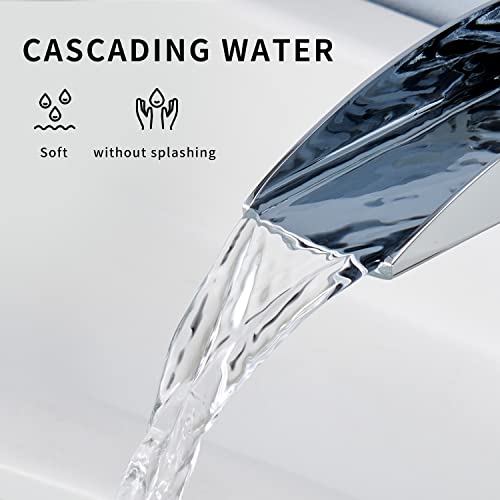 【Uscita a cascata】 L'area di uscita dell'acqua del rubinetto monocomando a cascata è più grande di quella del normale rubinetto.Può riempire rapidamente la tazza e non schizzerà o esce dal lavandino durante il lavaggio, risparmiando così acqua . Mostra la bellezza naturale dell'acqua che scorre e aggiunge un tocco di stile al tuo bagno.