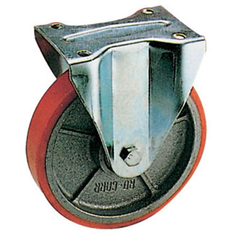 Descrizione Piastra in acciaio zincato, con ruota in lega di ghisa ricoperta in poliuretano rosso. Ruota da 125mm, portata massima di 180kg