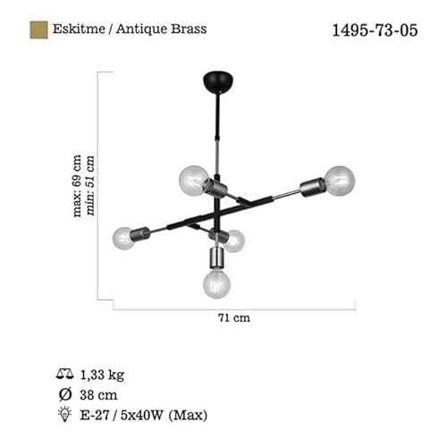 Homemania 1495-73-05 Lampada a Sospensione Tora Lampadario da Soffitto Oro, Nero Metallo, 38 x 71 x 69 cm, 5 x E27, 40W