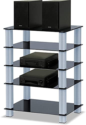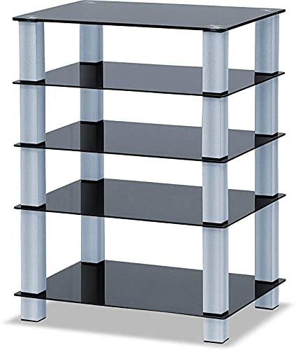 Homeology Trinity, supporto per TV a schermo piatto, in vetro, con 5 ripiani in vetro, colore nero lucido Gambe color argento.