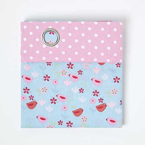 HOMESCAPES Coppia di tende in cotone con occhielli, motivo uccelli e fiori, colore blu e rosa, 117 x 137 cm