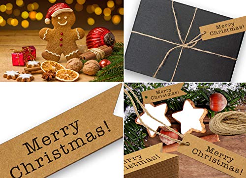 HOMETOOLS.EU® - 100 cartoncini di carta Kraft, etichette per regali, etichette 7 x 2 cm, con 10 m di corda di iuta per confezionare regali, Merry Christmask, marrone naturale