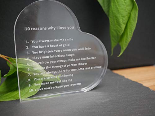 Homezone Acrilico Trasparente a Forma di Cuore 10 Reasons Why i Love You Fermacarte Sentimentale Messaggio Inciso Scrivania Accessorio Regalo Placca Arredo Casa Ufficio Decorazione