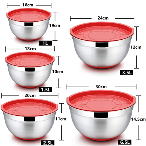 Homikit Set di 5 ciotole per insalata in acciaio inox, con coperchio rosso e fondo in silicone, multifunzione, impilabili, lavabili in lavastoviglie, 8 l, 5 l, 3 l, 2,5 l, 1,5 l