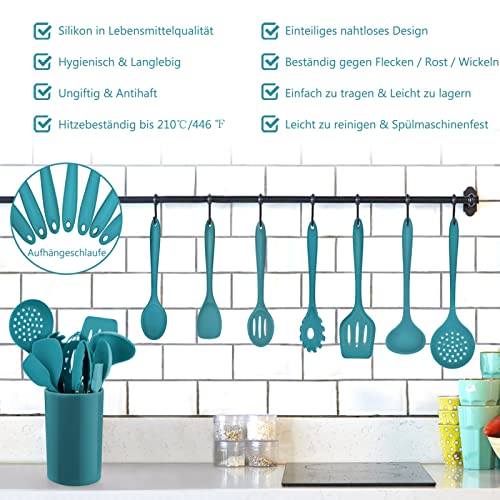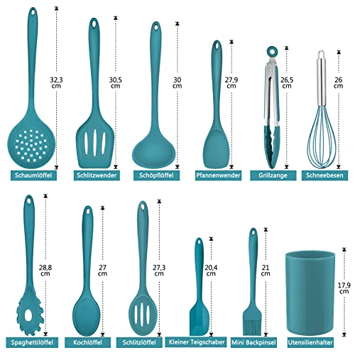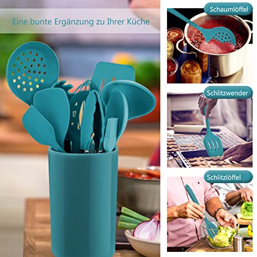 Homikit Set di utensili da cucina, 12 pezzi, in silicone, resistenti al calore, con porta utensili, sani e antiaderenti, lavabili in lavastoviglie, blu