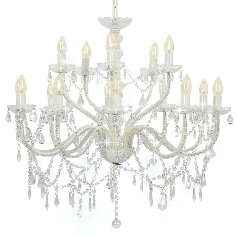 Descrizione: Caratterizzato da un design classico ed elegante, questo fantastico lampadario con cristalli e gocce scintillanti donerà sicuramente un aspetto audace ed attirerà l'attenzione all'interno della vostra casa. è adatto sia per uso residenziale che commerciale. La base a candelabro e le gocce trasparenti aggiungeranno un tocco di fascino antico e creeranno un bel gioco di luci. Potrete scegliere e installare lampadine E14 dai colori chiari, creando un'atmosfera di relax e riposo. Si prega di notare che le lampadine non sono incluse. Grazie agli accessori di montaggio inclusi, è possibile assemblare e installare la lampada a sospensione in modo facile e sicuro. Specificazioni: Colore: Bianco (struttura) + trasparente (gocce) Dimensioni tavolo: 80 x 74 cm (Diametro x A) Materiale: Metallo (struttura) + acrilico (gocce) Alimentazione: 230 V Potenza massima lampadine: 40 W. Tipo di attacco: E14 Con 15 porta lampade Le lampadine non sono incluse