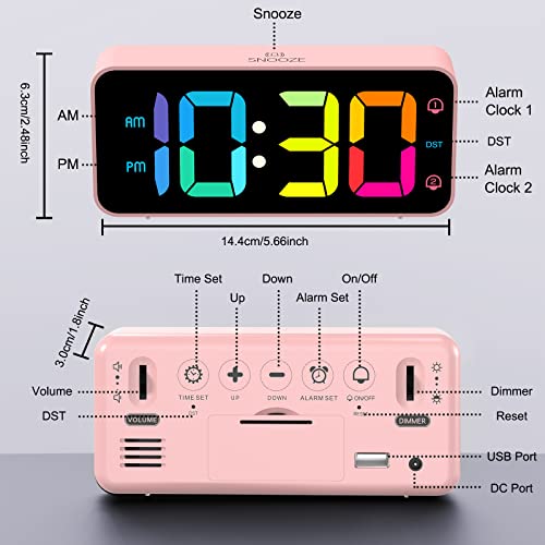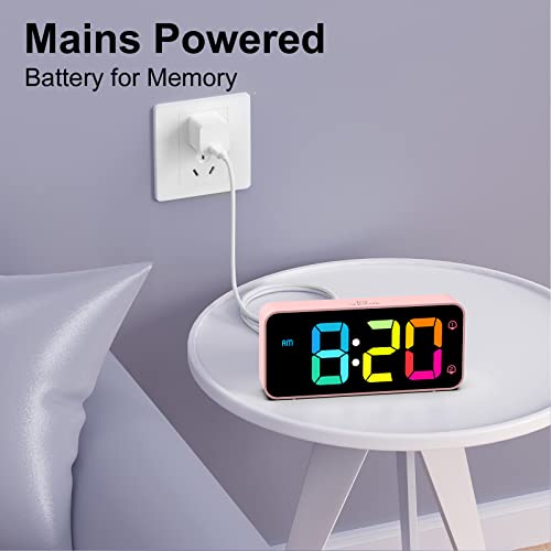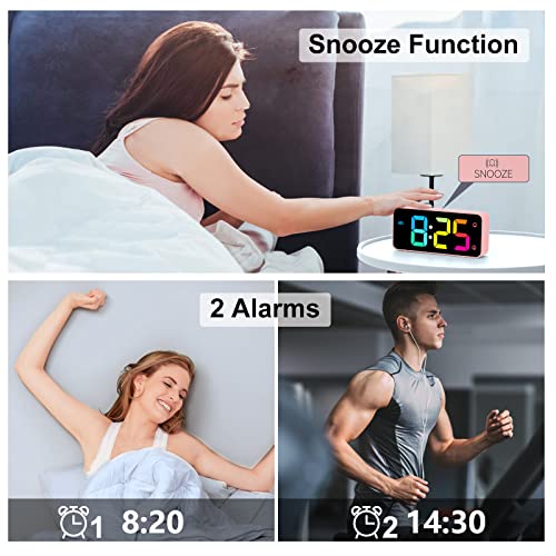 HOMVILLA Sveglia da Comodino, Sveglia Digitale con Led Numeri Grandi, 0-100% Dimmer, 90-120 dB Volume, 2 Allarmi, 12/24H, Snooze, Porta di Ricarica USB (Adapter Incluse), Rosa-Colorato