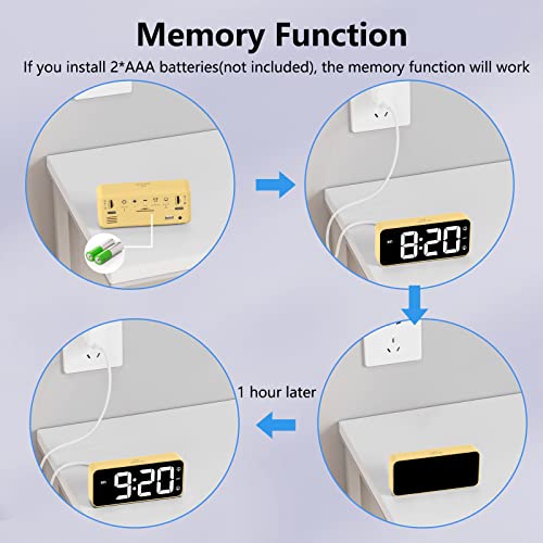 Sveglia digitale sempre accesa: Abbiamo già contenuto un cavo di ricarica USB e un adattatore nel nostro orologio digitale per la tua comodità di alimentazione. Ti consigliamo di installare una batteria 2*AAA (non inclusa) in caso di interruzione di corrente. Supportano solo le funzioni di memoria, escluso qualsiasi display o sveglia.