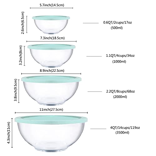 Homwin Insalatiera vetro, Ciotola di vetro con coperchio Set di 4(0,5 L, 1,0 L, 2,0 L, 3,5 L), Set Di Ciotole Impilabile, Ciotola per impastare, cucina, lievitazione, conservazione, fornitura
