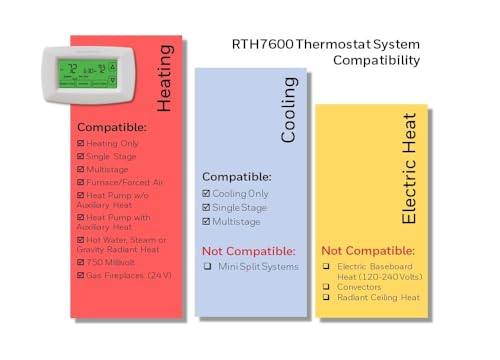 Compatibile con- riscaldamento e raffreddamento monostadio, riscaldamento e raffreddamento multistadio, solo riscaldamento, solo raffreddamento, forno (aria calda), aria condizionata centralizzata, pompa di calore senza calore ausiliario, pompa di calore con calore ausiliario, acqua calda, vapore o gravità, 750 millivolt e camini a gas.