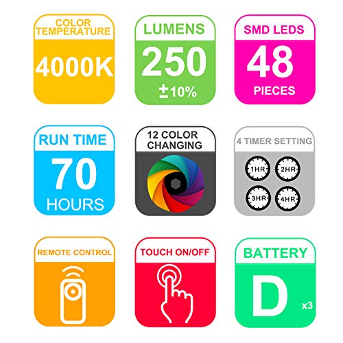 [12 colori e 4 modalità di illuminazione] - Funziona con telecomando a 24 tasti, incluso 12 colori a scelta e 4 modalità di illuminazione a FLASH, STROBE, FADE E LISCIA con impostazioni alte e basse o premere l'interruttore a pulsante sulla luce per cambiare il colore in bianco caldo/rosso/verde/blu.