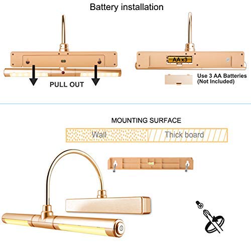 HONWELL Lampada per Quadri,Luci Specchio con Telecomando,Luci a Pittura Parete Alimentate con Batterie AA con Braccio Oscillante a 180° e Dimmer di Luminosità per Interni Quadri,Oro Rosa