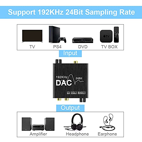 Hopbucan Convertitore audio digitale a analogico da 192 Khz con regolazione dei bassi e del volume, spdif/ottico/coassiale ad analogico