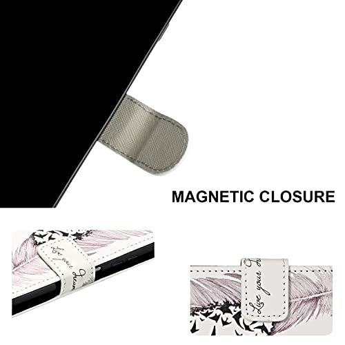 HopMore Cover a Libro per Samsung Galaxy A22 5G in Pelle con Silicone Morbido Custodie per Ragazzi Ragazze Donne, Portafoglio Disegni Custodia Antiurto 360 Gradi Case Accessori - Piume/Bianco