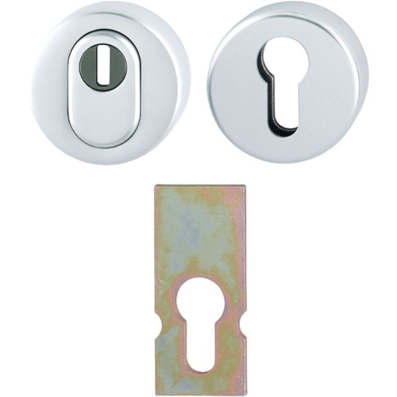 Coppia di rosette chiave di protezione in alluminio con coperchio del cilindro per porte esterne · Coperchio cilindro: Acciaio, per lunghezza cilindro sporgente 10-18 mm · Sottostruttura: zamak all'esterno, acciaio all'interno, camma di supporto · Fissaggio: viti nascoste, continue, filettate M5 · Spessore 15 mm · Ø 55 mm · Perforazione PZ · per spessore porta 57-62 mm + 67-72 mm Altre caratteristiche tecniche: · Tribuna cilindro: 10-18mm · Perforazione: PZ