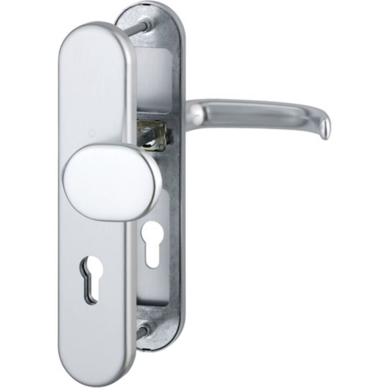 Per chiusura ante · Substrutture in acciaio attorno alla sottostruttura all'aperto e zama in scudo interno · Esterno: a gomito, pulsante fisso · con molla di ritorno all'interno: maniglia per la porta perdente · Connessione a pin rapida (con PIN