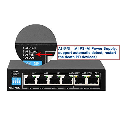 Hored AI106 - Smart Switch Poe a 6 Porte, 4 Porte Poe, 802.3af, 802.3at, 48 V, 60 W, Trasmissione Fino a 250 Metri, funzioni Smart