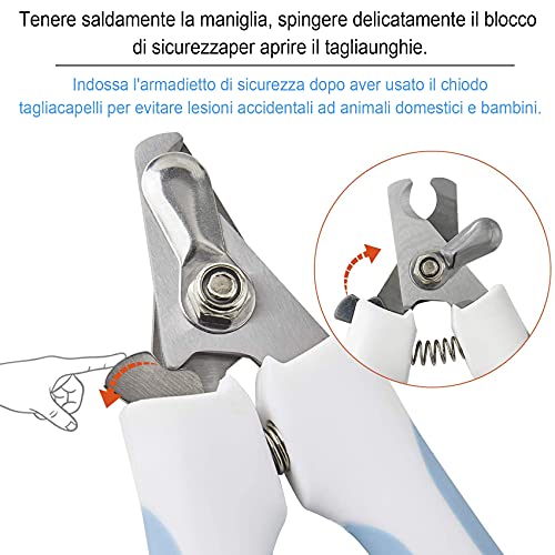 le lame sono in acciaio inossidabile anallergico e affilate. Le maniglie sono realizzate in gomma antiscivolo. La parte posteriore della lama è progettata con una protezione di sicurezza per evitare di tagliare troppo le unghie dei tuoi amici a quattro zampe e impedire che le unghie sanguinino.