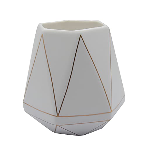 Hoshen - Portapenne in ceramica a forma di poliedro geometrico, linee dorate, per uso da scrivania, porta pennelli cosmetici, portapenne in ceramica, adatto per casa, ufficio, bianco opaco