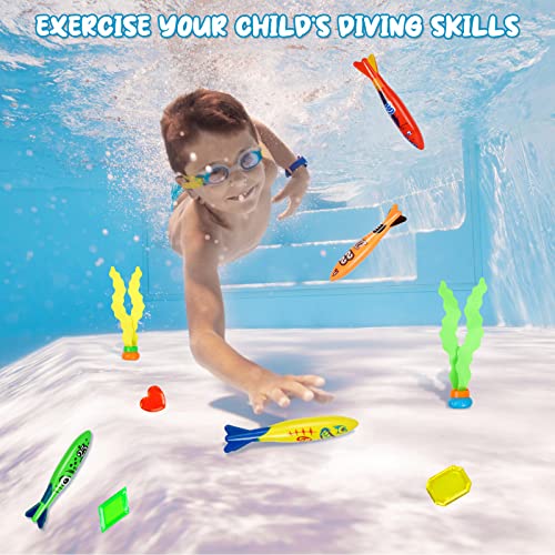Set di Giocattoli da Immersione: 17 pezzi di giocattoli subacquei, tra cui 8 squali subacquei, 3 pezzi di palline subacquee e 6 gemme. Il set di giocattoli subacquei è progettato per i bambini. Siluro: lunghezza 5,12 pollici, 37 g;