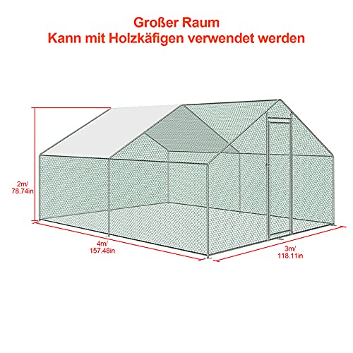 【Ideale per uso esterno】Dimensioni: 3 x 4 x 2 m. La copertura impermeabile resistente e protetta dai raggi UV protegge il pollame dalle intemperie e dagli agenti esterni. Pollaio ruggine, corrosione e resistente alla luce per una lunga durata.
