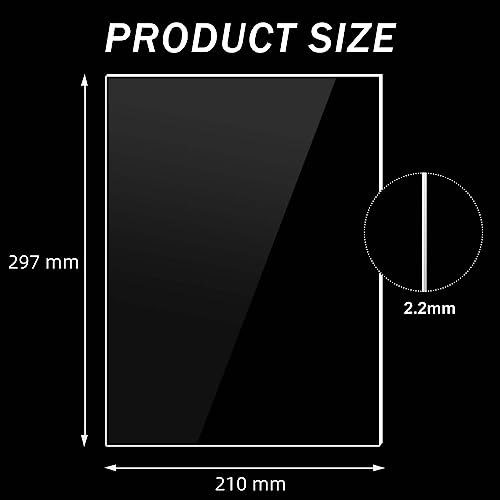 Foglio acrilico: ogni pannello misura 210 x 297 mm/formato A4, 2,2 mm di spessore. 6 pezzi in un pacchetto. NOTA: i fogli di plexiglass hanno una pellicola protettiva su entrambi i lati, si prega di strapparla prima dell'uso.