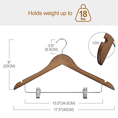 Appendini multifunzionali e salvaspazio- la linea di spalla sull'appendiabiti in legno è sagomata per aiutare a preservare la forma dei vestiti. Ci sono scanalature su ogni spalla da utilizzare per appendere canottiere, vestiti, cravatte, cinture, camicie da notte, scialli, tute e gonne senza che scivolino. che abbiamo aggiunto anche due clip metalliche rimovibili per appendere pantaloni di varie dimensioni per te, risparmiando ulteriormente spazio nel set di biancheria.