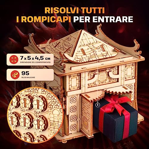 2-in-1: REGALO UNICO E SCATOLA REGALO WOW - La nostra scatola di legno non è solo un gioco di puzzle, ma anche una scatola regalo unica. Dispone di un scomparto segreto che misura 1,7 x 2,7 x 1,9 centimetri, dove puoi nascondere un regalo aggiuntivo come gioielli, denaro o una nota sincera con i desideri. Le possibilità sono infinite, rendendola il regalo perfetto per ogni occasione. Sorprendi i tuoi cari con il miglior regalo di un gioco escape room alla loro prossima festa di compleanno!