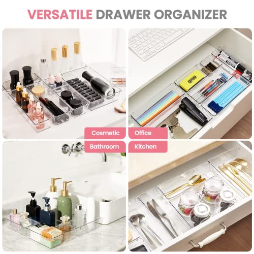 HOUSE DAY Vassoi organizer per cassetti per trucco, 24 pezzi, organizer per cassetti trasparenti di 4 dimensioni con cuscinetti in silicone, organizer e portaoggetti per vanità, organizer per cassetti