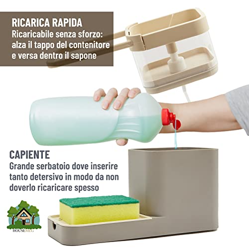 Housemeg Dispenser Sapone Cucina Manuale con Spugna per Piatti Dispenser Detersivo Sapone Liquido Piatti con Porta Spugna e Oggetti Utili in Plastica