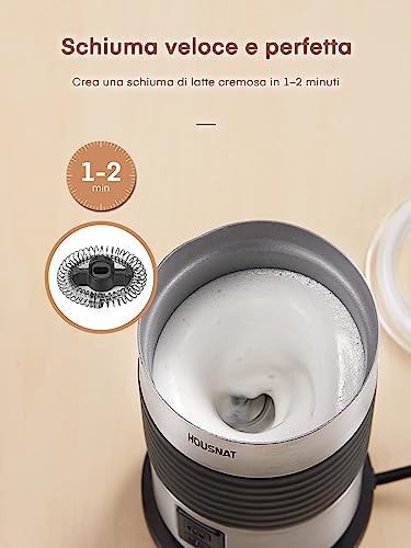 HOUSNAT Montalatte Elettrico Cappuccino, 4 in 1 Schiuma Latte 400W 200ML, Controllo della Temperatura Strix, Rivestimento Antiaderente, Ideale per Latte, Caffè, Cioccolato Caldo