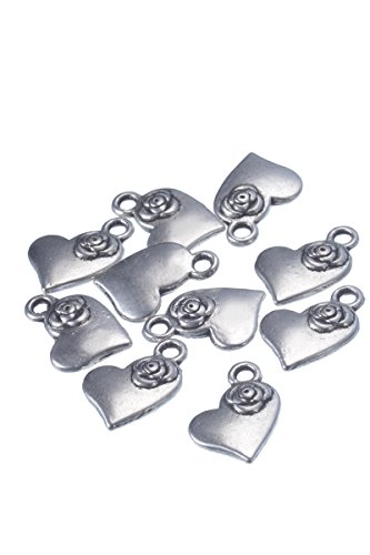 Housweety - Charm a forma di cuore con fiore, argento anticato, 50 pezzi