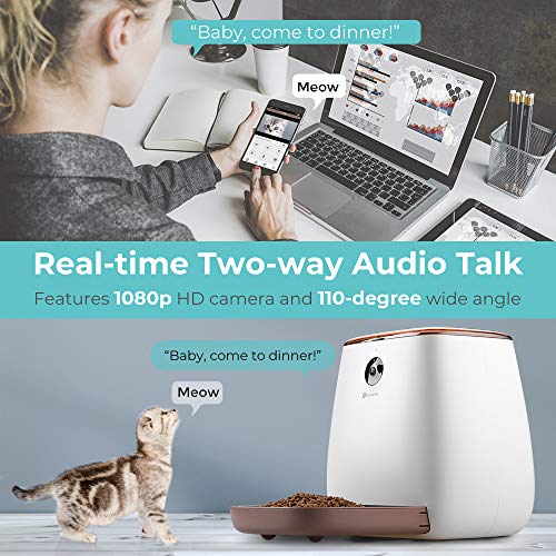【1080P FHD Videocamera】Il dispenser cibo gatti è dotato di 110 gradi grandangolo e visione notturna per osservazione in giorno e in notte dello stato dell'animale domestico, audio bidirezionale ti consente di interagire con loro attraverso il microfono. Si può registrare qualche parola per chiamare gli animali a mangiare.