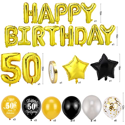 【Oro Nero 50 Anni Compleanno Addobbi】Oro nero 50 anni compleanno decorazioni includono: 1 set di "HAPPY BIRTHDAY" palloncini in alluminio, 1pcs palloncini in alluminio numero 50, 3pcs 50 anni palloncini in lattice nero, 3pcs 50 anni palloncini in lattice oro, 3pcs palloncini in lattice oro, 3pcs palloncini in lattice nero, 6pcs palloncini in lattice argentato, 6pcs palloncini in lattice coriandoli, 1pcs elio palloncino di stella nera, 1pcs elio palloncino di stella d'oro, 1 rotolo di nastro.