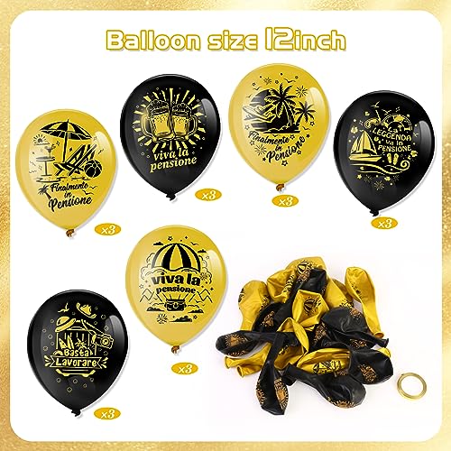 Decorazioni Pensione: Riceverete 1 confezione di Striscioni Finalmente in Pensione + 18pz Palloncini Pensione Palloncino Finalmente in Pensione in oro nero, con 6 disegni diversi. Perfetti per le decorazioni per il pensionamento.