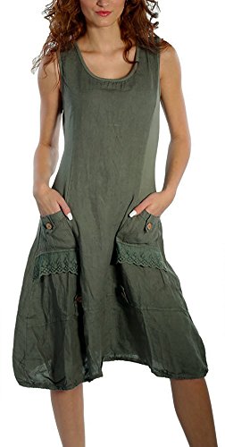 Hownew-X Vestito da Donna Abito Senza Maniche Estate Lino Retro Vintage Gonna M Verde